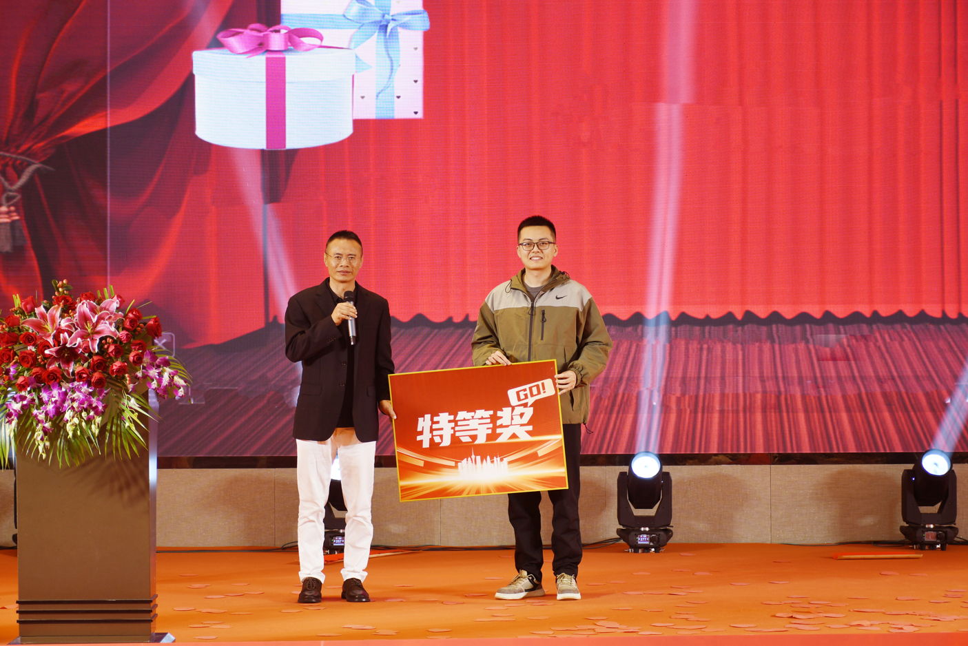 特等奖环节更是惊喜不断,原本仅有一个重磅特等奖,刘董事长抽出幸运儿后,看见台下热情洋溢、期待满满的脸庞,感受到大家高涨的热情,便决定再添惊喜自掏腰包增加特等奖名额,郑总经理和郑副总经理深受气氛感染,一同额外追加六个特等奖,这一波追加举措如星火燎原,瞬间将现场氛围推向高潮,掌声欢呼声几乎要掀翻屋顶。